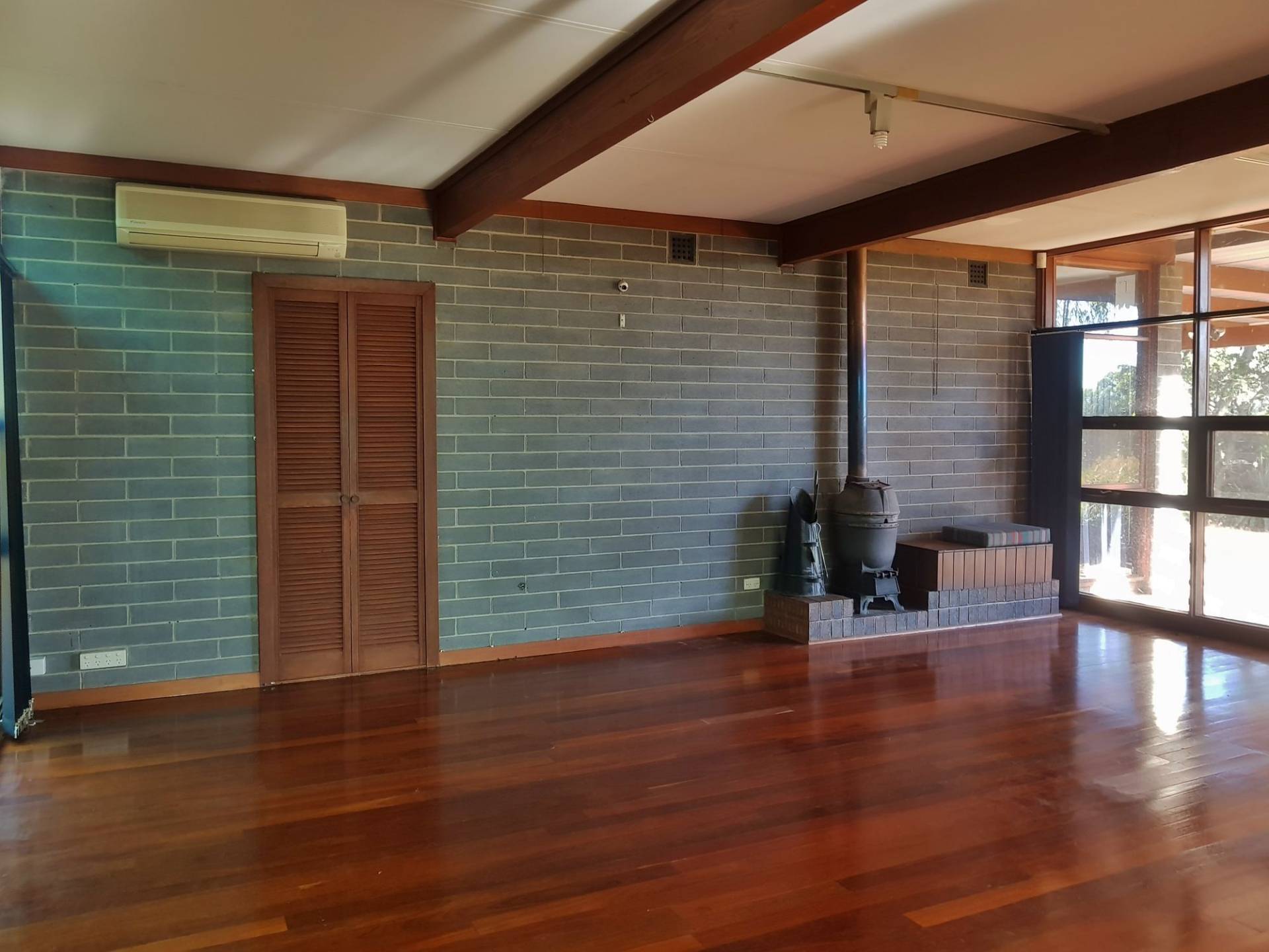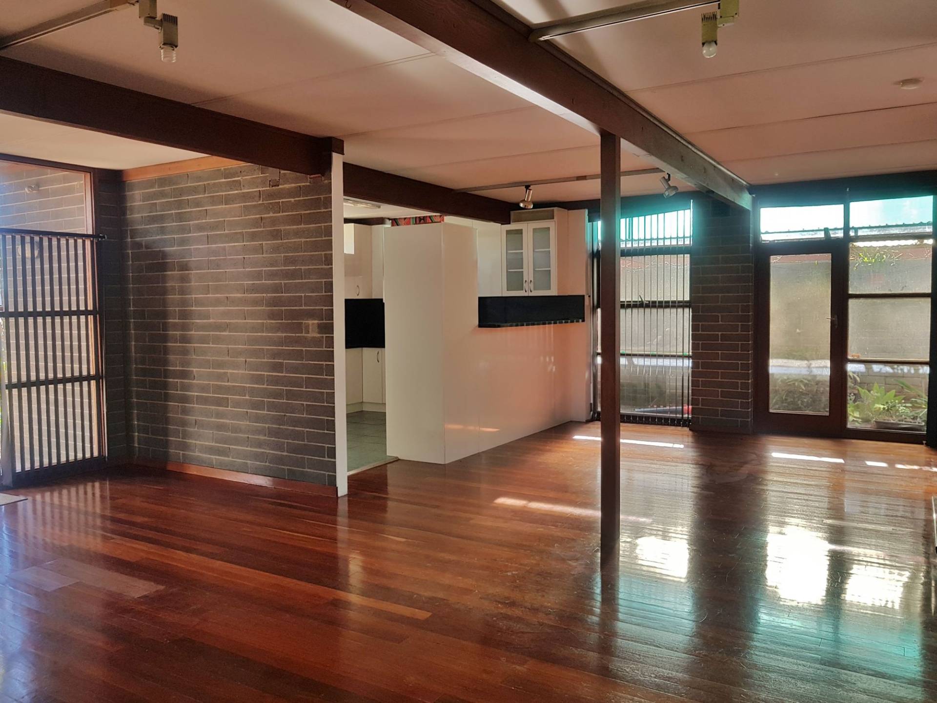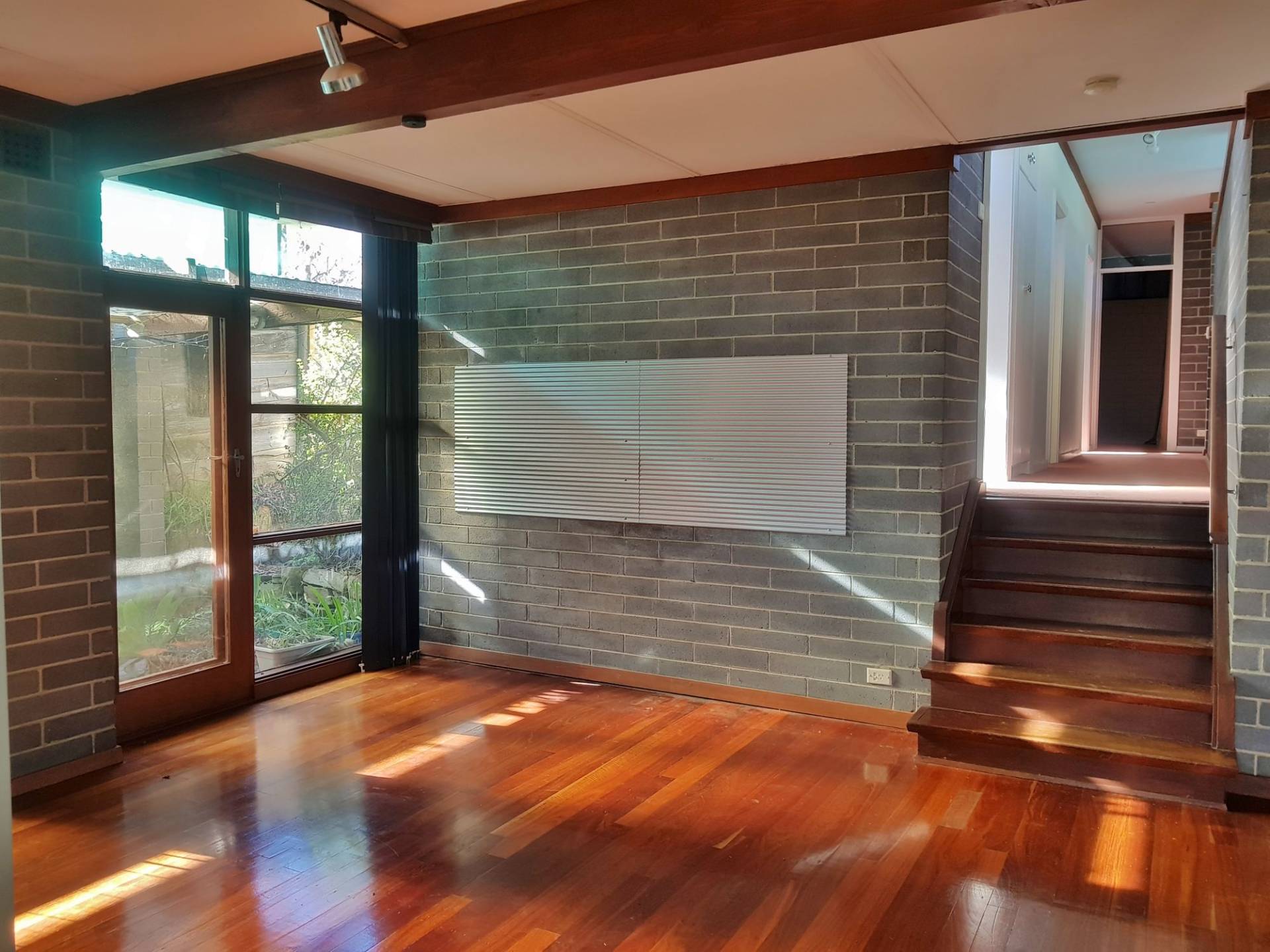 -Light filled open plan living with timber floorboards, exposed brick & split system A/C, with large windows overlooking a tranquil courtyard