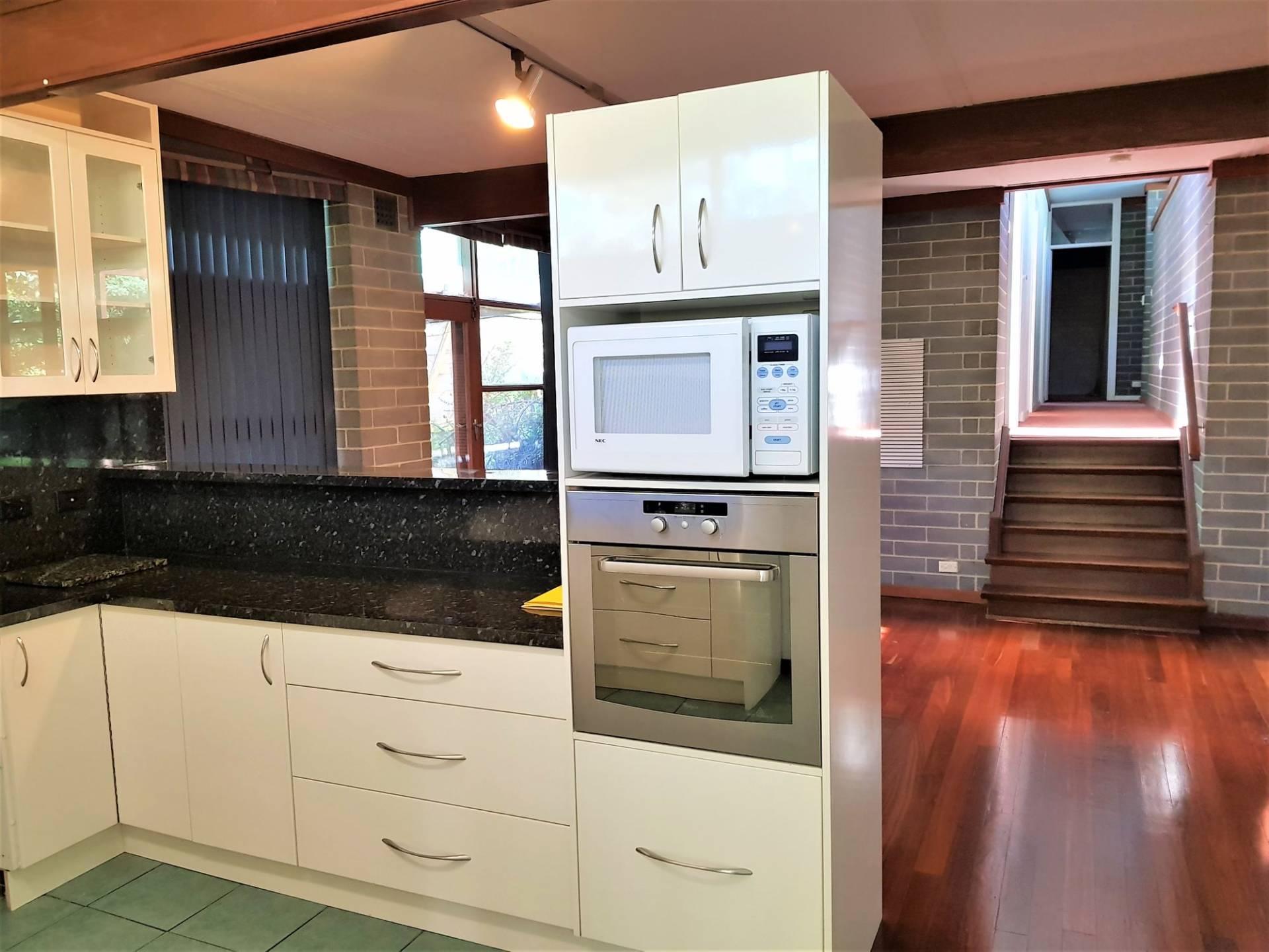 -Updated kitchen with gas cooking, dishwasher space, wall oven & microwave