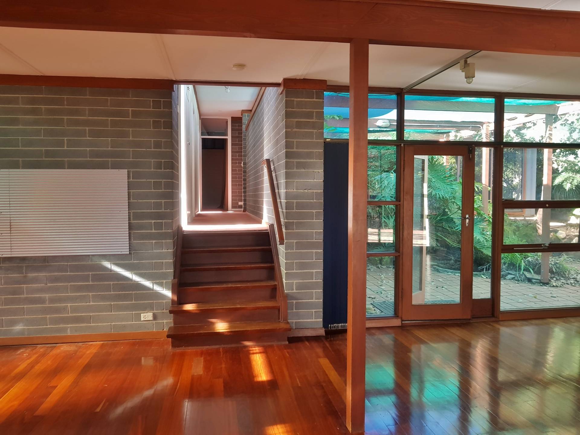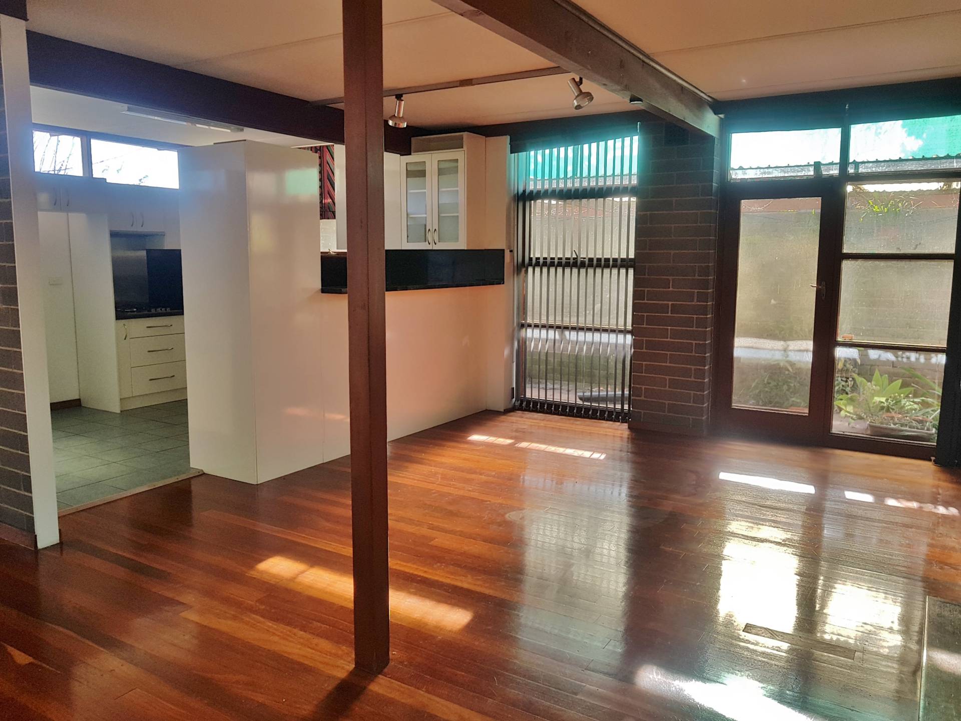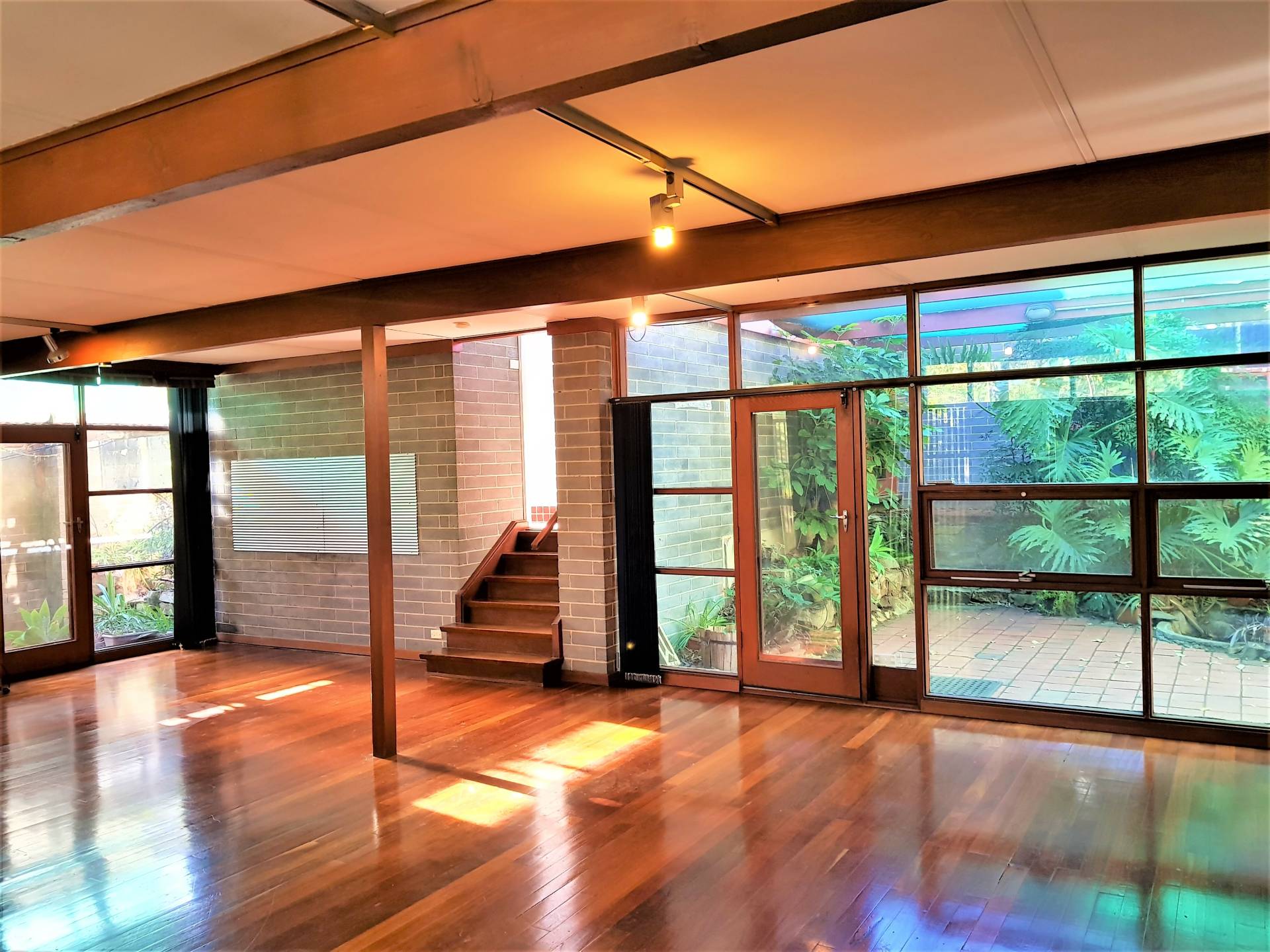 -Light filled open plan living with timber floorboards, exposed brick & split system A/C, with large windows overlooking a tranquil courtyard